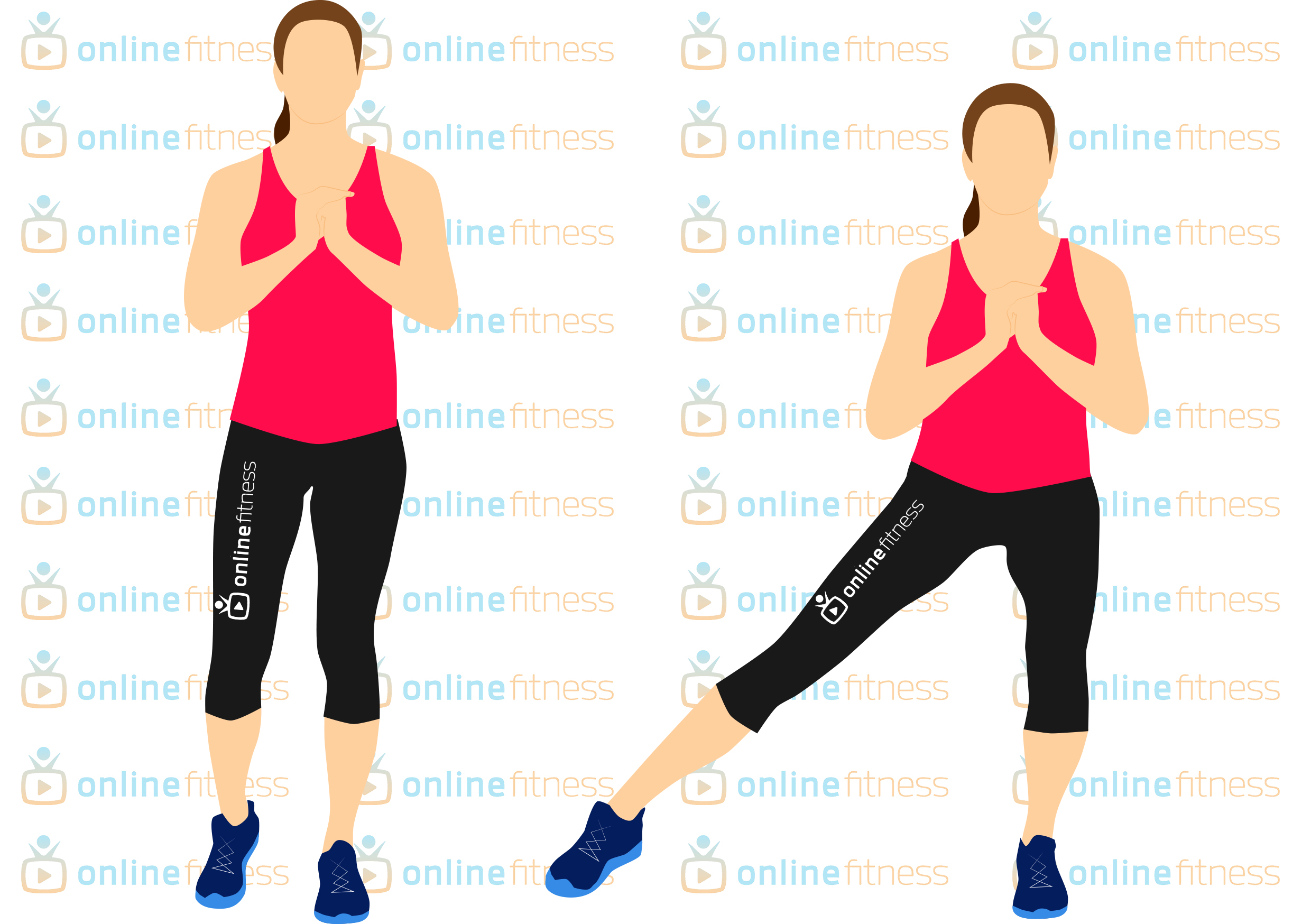 Postavíme se rovně, zpevníme bříško a s výdechem uděláme výpad do strany. Dáváme si pozor, abych koleno nepředbíhalo špičku. S nádechem jdeme zpět do rovného postavení.